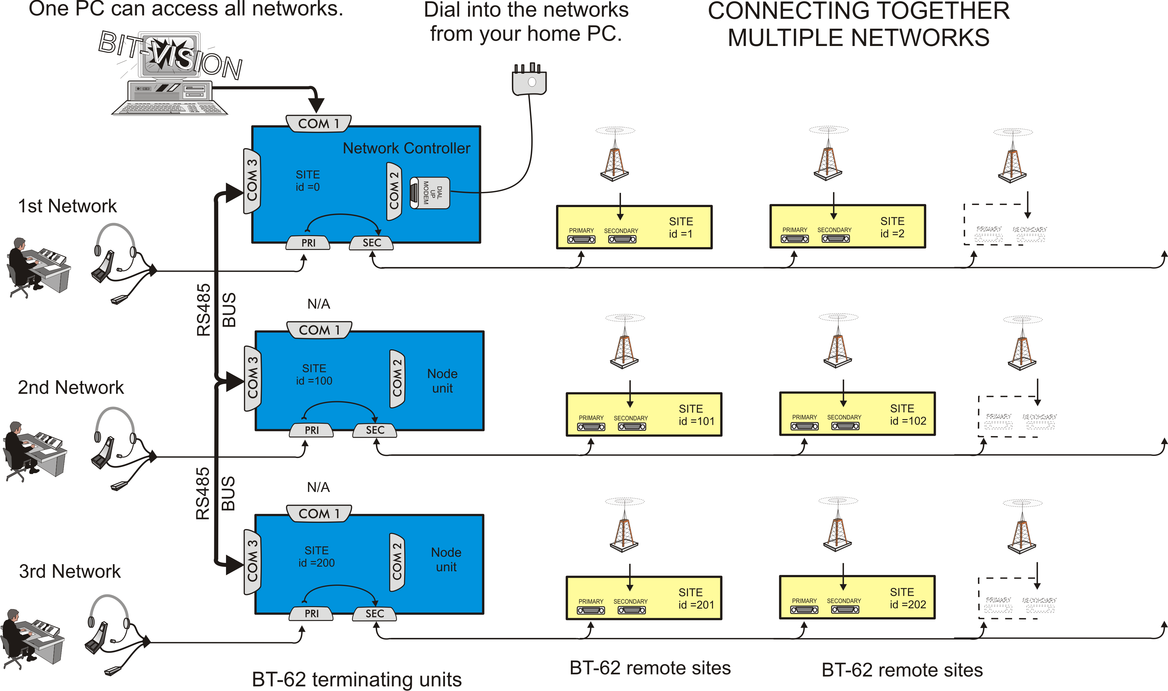 Rather than have a separate PC on each Network, One PC can be made to access any number of different multiple networks at once, by fitting a BT-xx to the terminating end of each network. These units have an RS485 bus connection on COM3 which allows them to be daisy chained together. This allows data packets to be automatically routed the right network like a telephone exchange.. Radio room Congestion Where the radio room is very congested, it may not be possible to put a terminating unit on every network. In which case This way when a message is sent it will always get through, regardless of what other networks have voice audio on them. However this is not strictly necessary