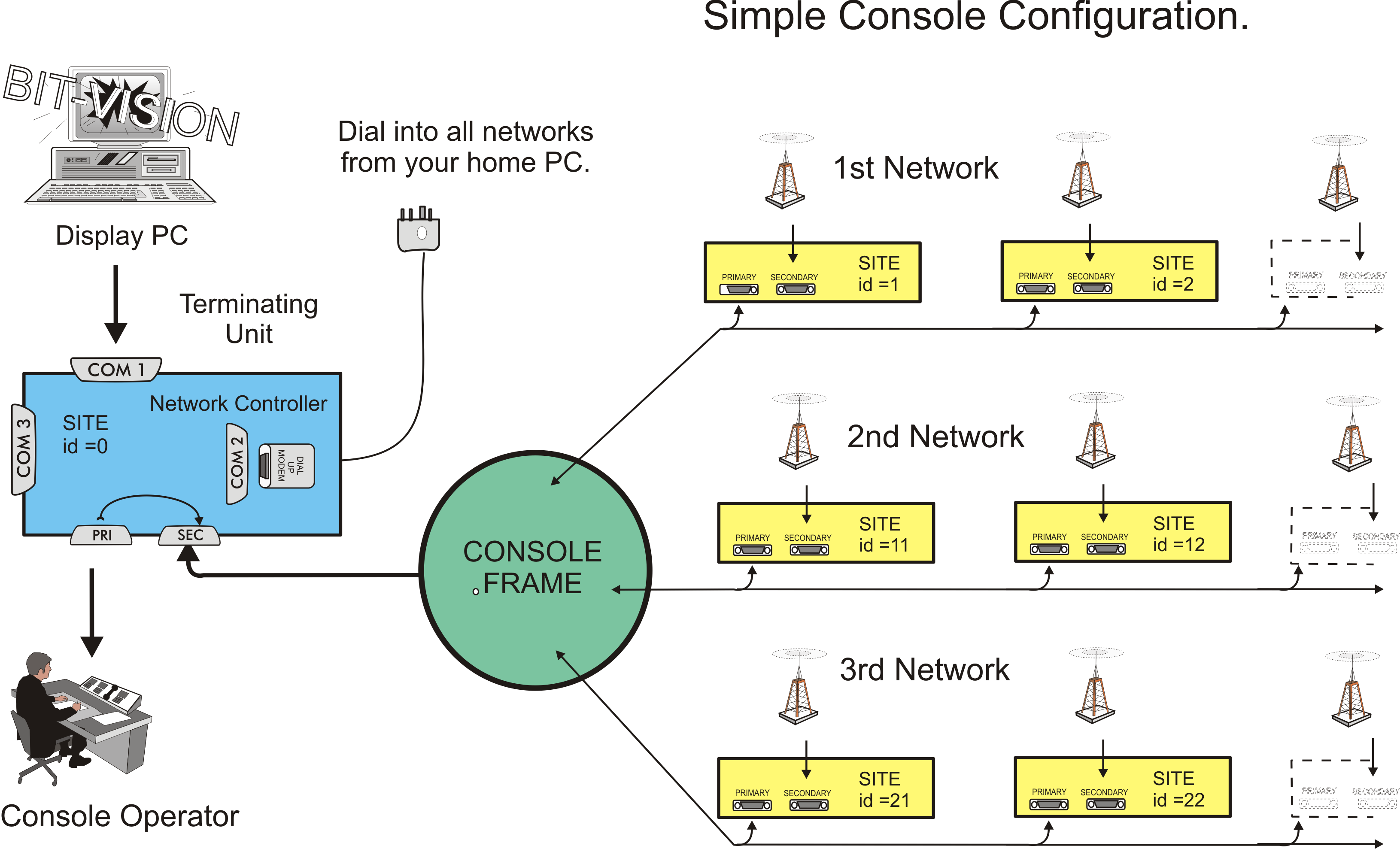 Even if main PC is off, Technicians can call in on their home PC and access entire radio network. they can also look at a log of file of alarms received during the night so far. |
