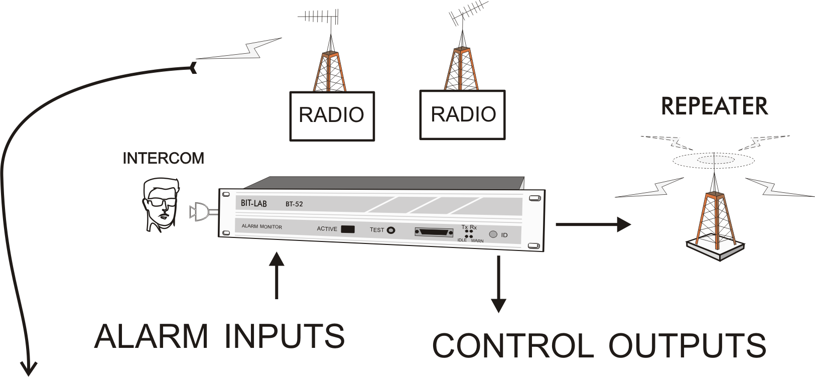 Following an alarm event the BT-xx units will dial up a selection of numbers until it contacts a BIT-VISION program or BT-62 network controller. Spurs to radio connected sites may be added by using the VF interface on the rear of the BT-62.. |
